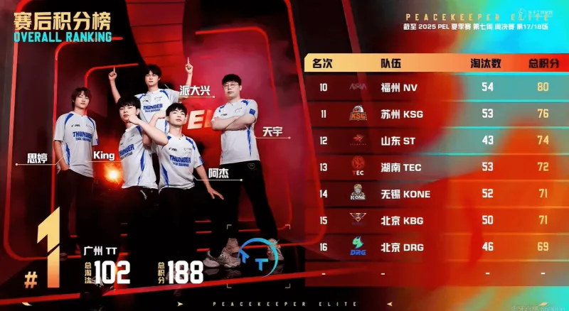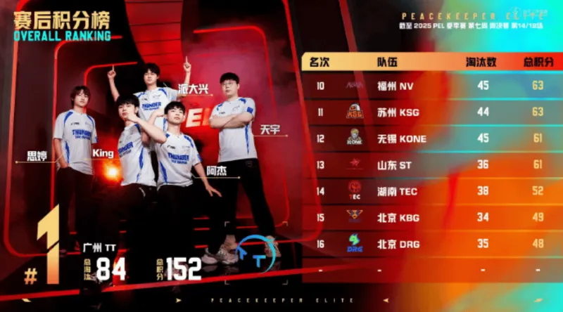 11分钟,VS守株待兔等到了TC挨个出击的机会,最终TC被TJB和VS联合淘汰,并且VS无伤亡。决胜时刻,信号圈缩在靶场附近,圈内剩余广州TT战队、江苏VS战队和深圳STE战队,此时场上3v2v2。VS战队先被淘汰出局,随后剩余两队展开对战,STE战队出枪破点,TT战队先倒两人,最终派大兴独狼作战精准出枪将STE战队逐个击破拿下比赛,TT获得本场比赛胜利。