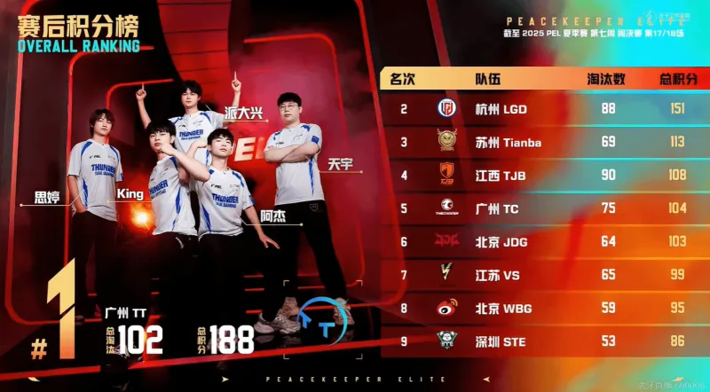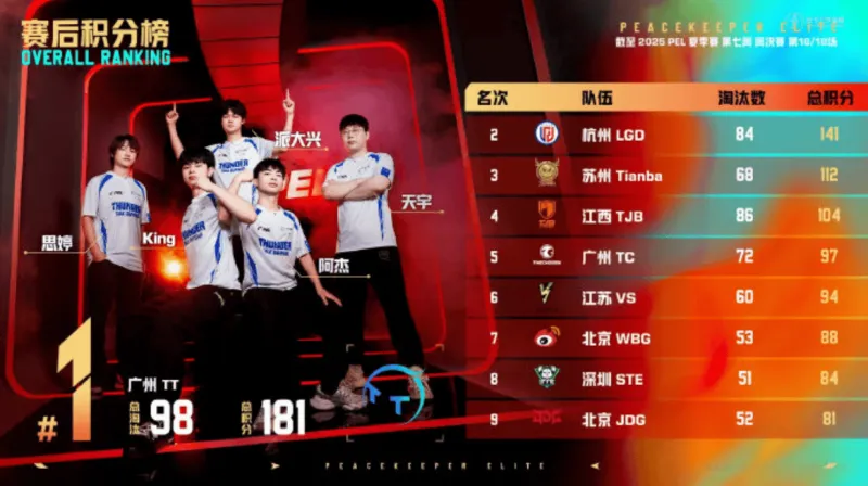 开局,TJB与VS共同roll点,TJB-花花率先击杀一个后,双方展开了8分钟的拉扯战,无事发生,同时TT两人被守卫击倒,但队友支援及时,也无伤亡。决胜时刻,信号圈缩在龙城附近,圈内剩余广州TT战队、江苏VS战队和北京JDG战队,此时场上4v3v1。JDG战队独狼先被VS战队淘汰出局,随后剩余两队展开对战,派大兴一雷双响帮助队伍拿下比赛,TT获得本场比赛胜利。