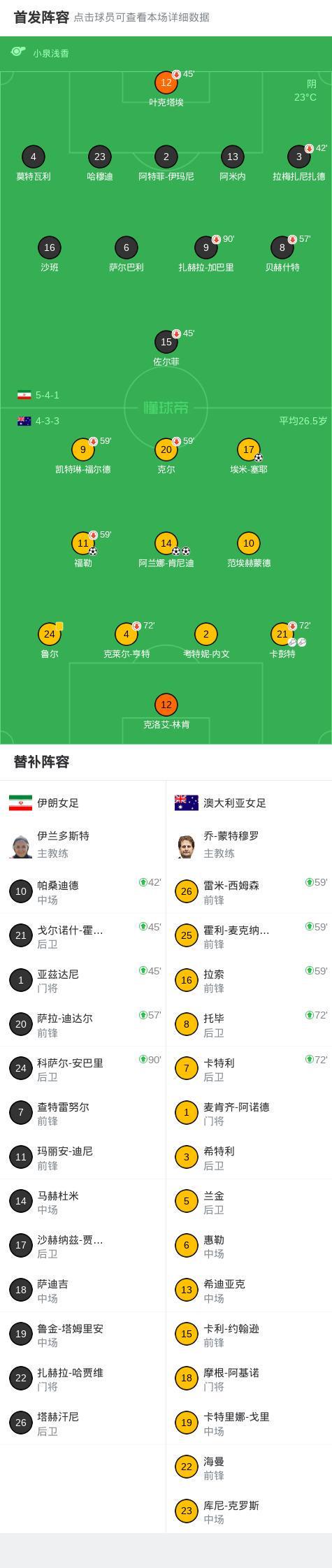北京时间3月5日女足亚洲杯 小组赛 第2轮,伊朗女足对阵澳大利亚女足。澳大利亚女足埃米-塞耶破门,福勒破门,阿兰娜-肯尼迪梅开二度。最终比分伊朗女足 0-4 澳大利亚女足。